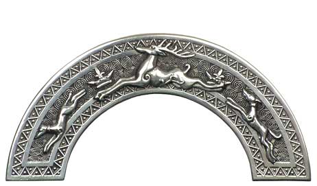 Brown dress sporran with a deer and hounds cantle (Pewter top) The sporran is made with lorica and faux fur and is availble with either crossed or straight tassels.